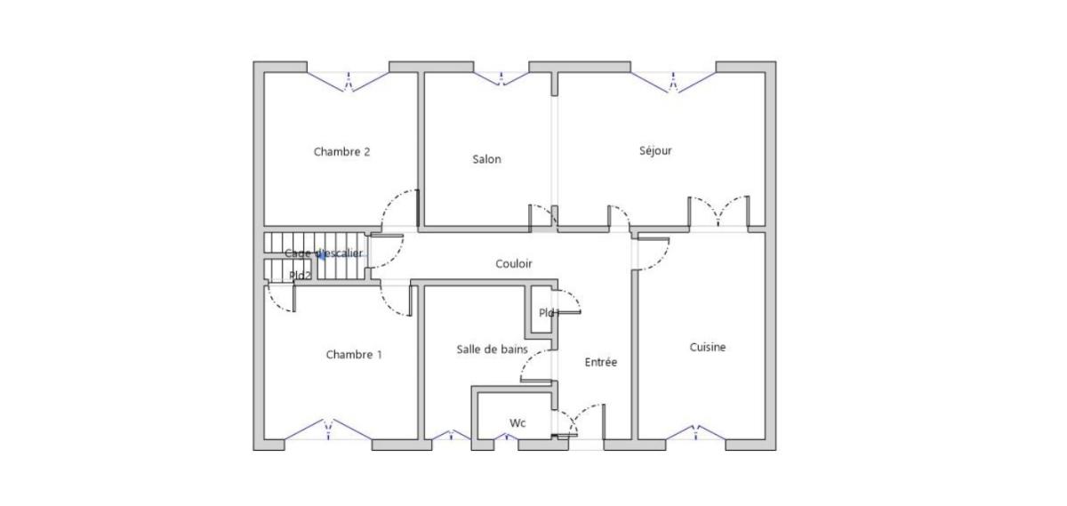 RDC : Entrée, WC, salle à manger, salon, cuisine aménagée, dégagement couloir, salle de bain, 2 chambres.
