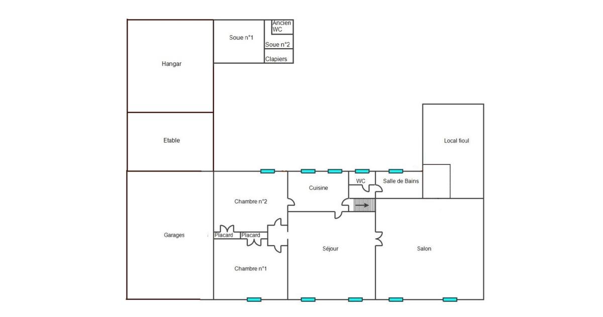 Couverture tuiles plates, simple vitrage bois, porte PVC, chauffage fioul, ballon électrique, tout à l’égout, électricité à revoir.